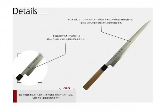 青二鋼とは、クロムやタングステンを添加する事により摩耗性に優れた鋼材で、一度にたくさんの食材を切る方にお勧めの包丁です。