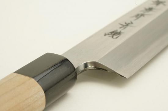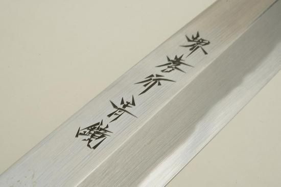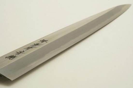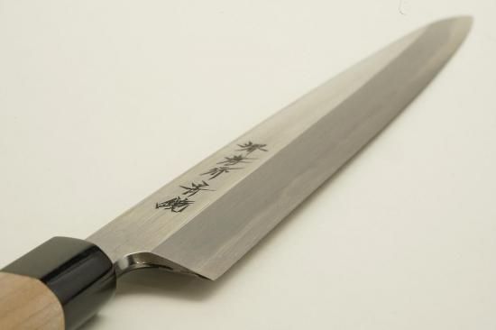 青二鋼の包丁の表(平の部分)を鏡のように磨いた美しく優雅な正夫包丁です。