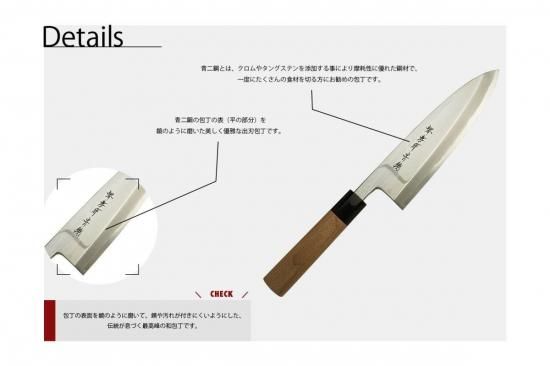 青二鋼とは、クロムやタングステンを添加する事により摩耗性に優れた鋼材で、一度にたくさんの食材を切る方にお勧めの包丁です。