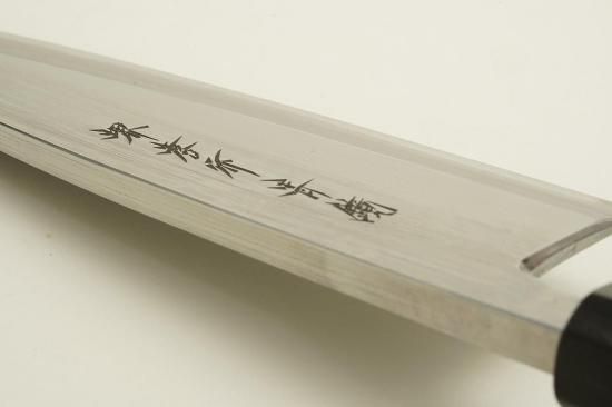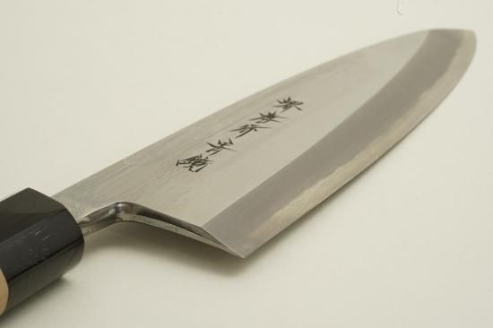 青二鋼の包丁の表(平の部分)を鏡のように磨いた美しく優雅な出刃包丁です。