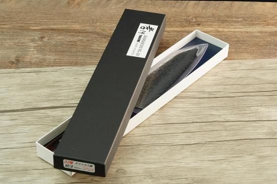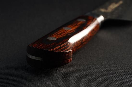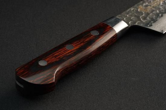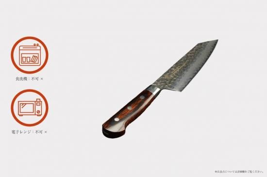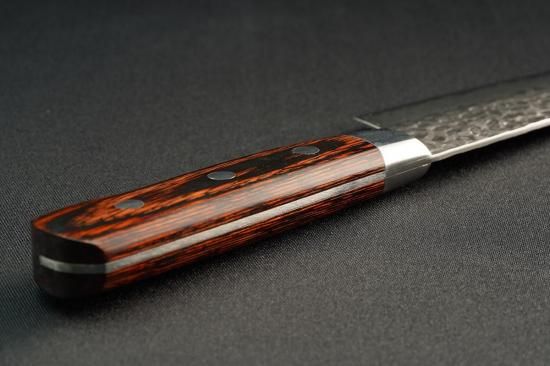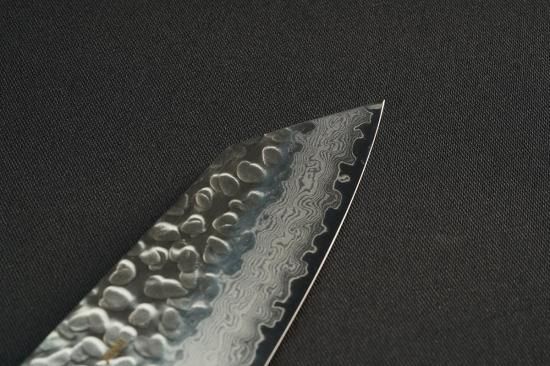 ミルフィーユのような多層鋼の美しい模様が魅力的で、叩いて槌目をつけることにより刀身が引き締まり、より切れ味が増しています。