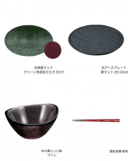 シックなマットにプレート・小鉢・お箸・箸置きと日々の食卓で活躍するアイテムを中心にしたセットです。